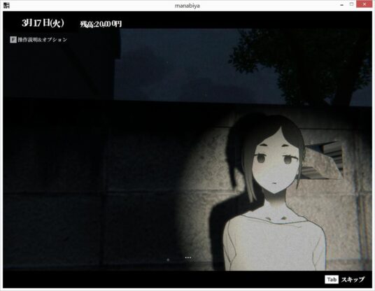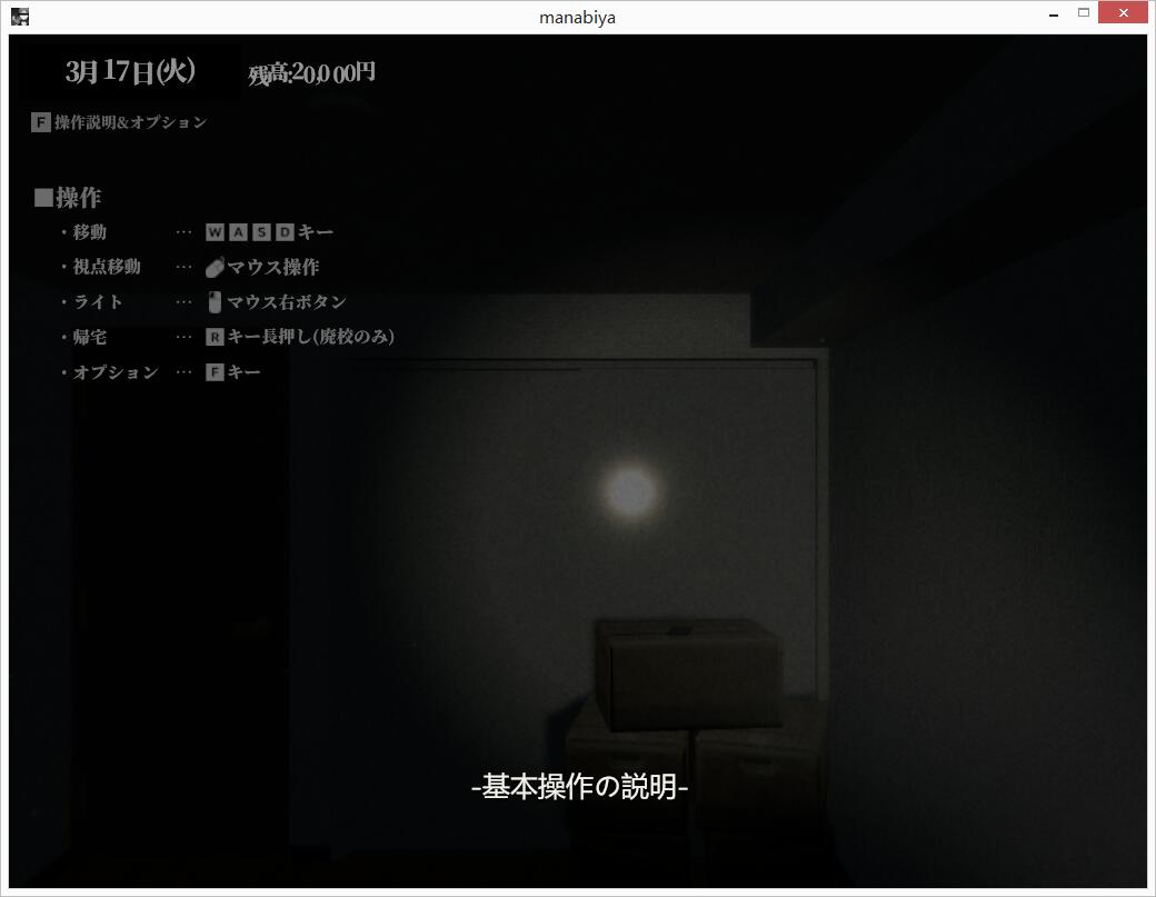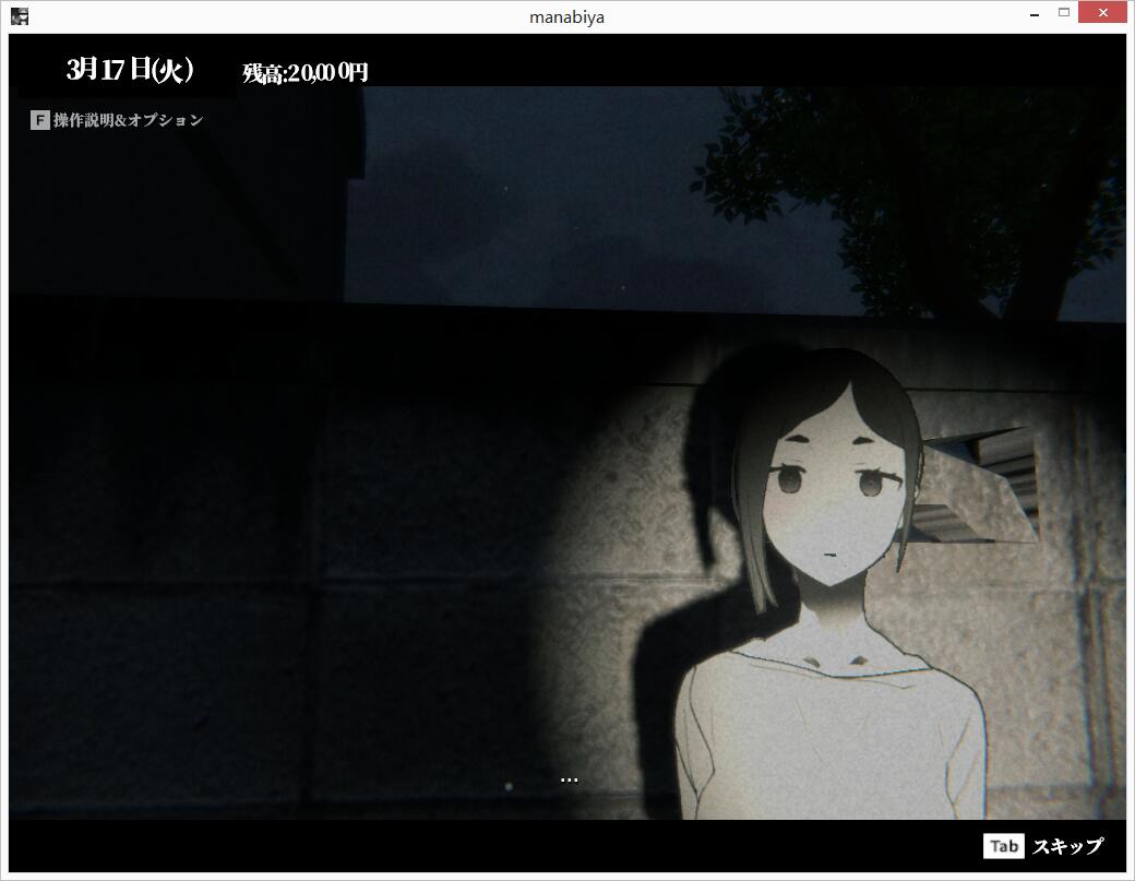 一个简单的同人3D游戏。故事舞台是已成为材料储存室的废校。虽然氛围很有恐怖游戏味道,不过没有任何恐怖要素。移动时是3D第一人称视角。这是关于被女友甩掉的主角,在搬家前一周时间里,在废校尽情地的玩躲猫猫游戏。找到她们和她们搭话,就能触发事件。话说,这画面一开始看起来还真的以为是恐怖游戏~囧~不过该游戏居然有mac os版本的,这下苹果电脑也有点开心了~