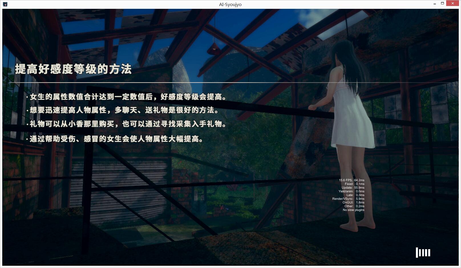 安装说明:exe文件,无须安装打开就可以玩。win7未测试,电脑不精通者,慎下,安装问题不解决!因截图均为游戏内截图,所以游戏都是经过测试可玩后才上线的,说不能玩、不能安装等问题一律不解决!首次打开白屏,将文件总名称更改为拼音即可解决白屏问题,更改后,启动游戏点AI-Syoujyo.exe。电脑配置不高者,慎入,不然会很卡!